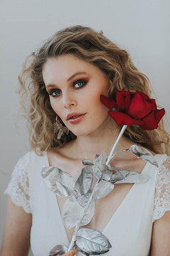 Der Make Up Artist Lars Rueffert zeichnet für die roten Lippen verantwortlich. Er zeigt in dieser Bridal Inspiration die ganze Kunst des verführerischen Make-ups und Hairstylings: Mal offene wilde Haare - just like out of bed- gepaart mit sexy Lippen und rauchigen Augen, dann wieder glänzend, rote Lippen, an denen kein Blick vorbeiführt. Das Styling komplett machen florale Accessoires wie ein Halsband mit einer voluminösen roten Rose oder silberner Haarschmuck.