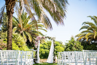 Das Agroturismo Can Gall liegt im Norden Ibizas und ist umgeben von Obstplantagen und den Bergen. Das 300 Jahre alte Farmhaus verbindet ibizenkische Ursprünglichkeit mit purem Luxus. Der naturnahe Ansatz und der Rundumservice ist das, was Brautpaare lieben. Auch Alex und Louise haben sich für diese relaxte und anspruchsvolle Art und Weise ihre Hochzeit zu feiern entschieden. Die perfekte Kulisse war für sie dafür das Can Gall. Im makellosen Garten fand die Trauzeremonie vor circa 65 Gästen statt. Vor dem kräftige Grün bildete die weiße Dekoration einen schönen Kontrast und wirkte luftig elegant.