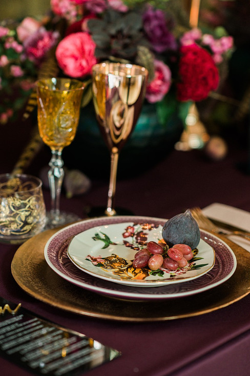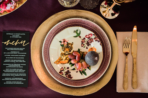 Goldene Platzteller und Besteck werden durch farbintensives Porzellan richtig zur Geltung gebracht. Schwarze Metallstühle an der langen dunklen Tischdecke sorgen für eine moderne Anmutung des Konzeptes, während die dekorative Anmutung der der Nelken, Freilandrosen oder des Zierkohls durch echte Fasanenfedern und Beeren aufgelockert wird. Die fast schon barocke Anmutung wird durch die Zugabe von Aubergine, Feigen und Weintrauben noch unterstrichen.