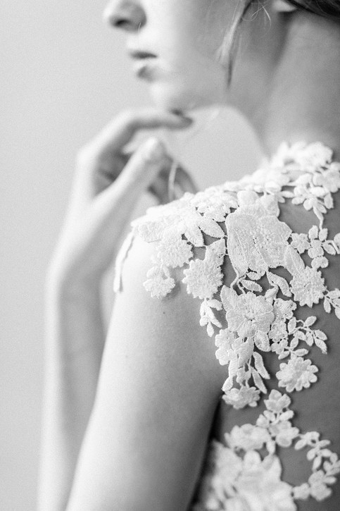 Kunstvoll und besonders stimmungsvoll hat Jutta Matveev in Schwarz-Weiß fotografiert. Die schwarz-weiß Fotografien erweitern die Fotostrecke um sehr ausdrucksstarke Fotos. Wir sind große Fans von den wohl komponierten Aufnahmen ohne Farbe. Die monochromen Bilder sind stark gestaltet und sehr atmosphärisch. Durch den Wegfall der Farbe sieht man noch mehr den Inhalt des Bildes: Die Stimmung in den Gesichtern, die Zartheit der Spitze oder auch die Bewegungsunschärfe. Der feine Umgang mit Licht kommt in Schwarz-Weiß noch besser rüber. Und der Kennerblick erkennt auch hier das Filmkorn, das so typisch ist für die Fine Art Fotografie.